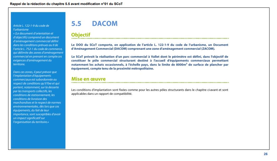 Néanmoins, comme l'a expliqué le Président de Sèvre-et-Loire dans son courrier au Vice Président en charge du SCoT, le projet de ZAC n'était pas compatible avec ce SCoT. D'où la nécessité d'une modification du document d'urbanisme "permettant de rendre compatible notre outil de planification et d'aménagement avec le projet de ZAC".Une enquête publique a eu lieu fin 2019. Le but de la modification du SCoT est de simplement changer une phrase du DACOM. Dans sa version de juin 2015, le DACOM mentionne une "limite de 8000 m² de surface de plancher par équipement, compte tenu de la proximité métropolitaine". Dans la version soumise à l'enquête, il est question d'une "surface de vente maximale de 8000 m² par équipement". Il n'y a donc plus de limite pour la surface de plancher, regroupant non seulement la surface de vente (partie accessible aux clients) mais aussi toutes les réserves, les accès de livraison ou encore la partie administrative à laquelle les clients n'ont pas accès.