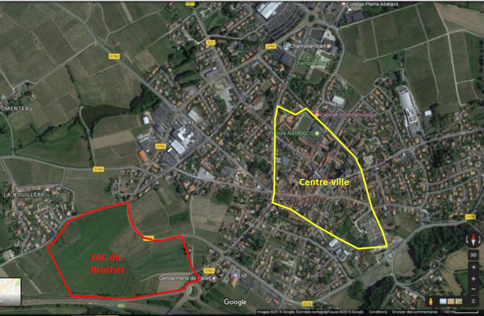 La ZAC du Brochet va s'étendre sur 17.3 hectares. Ceci est équivalent à la surface de tout le centre-ville de Vallet, en allant du cimetière jusqu'à l'école publique. Voir le plan détaillé du centre-ville de Vallet